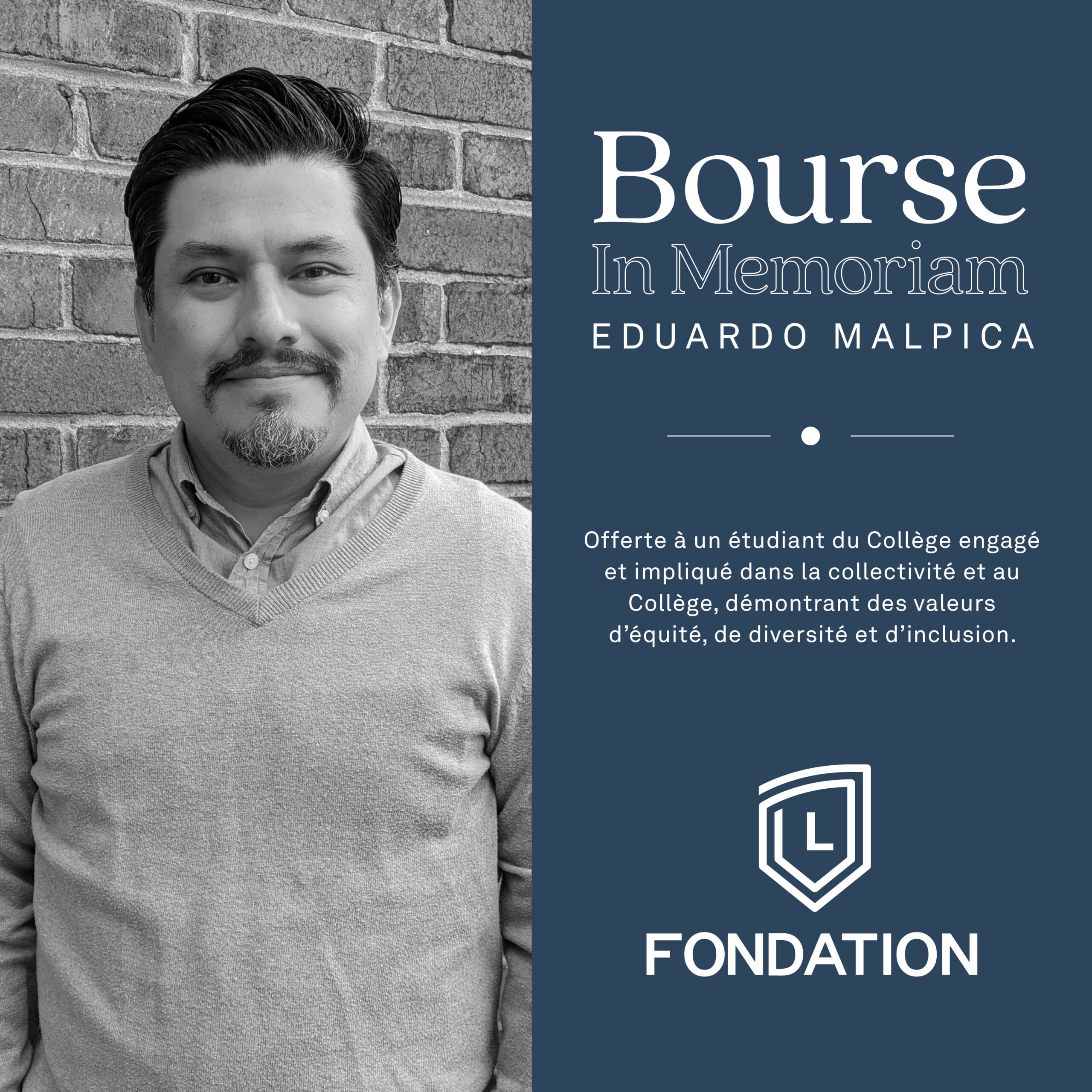 TROIS-RIVIÈRES, le 23 novembre 2023 – La Fondation du Collège Laflèche annonce aujourd’hui la mise en place d’une nouvelle bourse In Memoriam en hommage à M. Eduardo Malpica, professeur en sociologie dans le programme Techniques d’éducation spécialisée intensif au Collège Laflèche, dont le décès a secoué la communauté en 2023. Cette bourse sera remise en avril 2024 à un.e étudiant.e qui se démarque par son implication dans la collectivité et au Collège, à l’image de M. Malpica qui plaçait l’engagement citoyen au coeur de ses priorités.